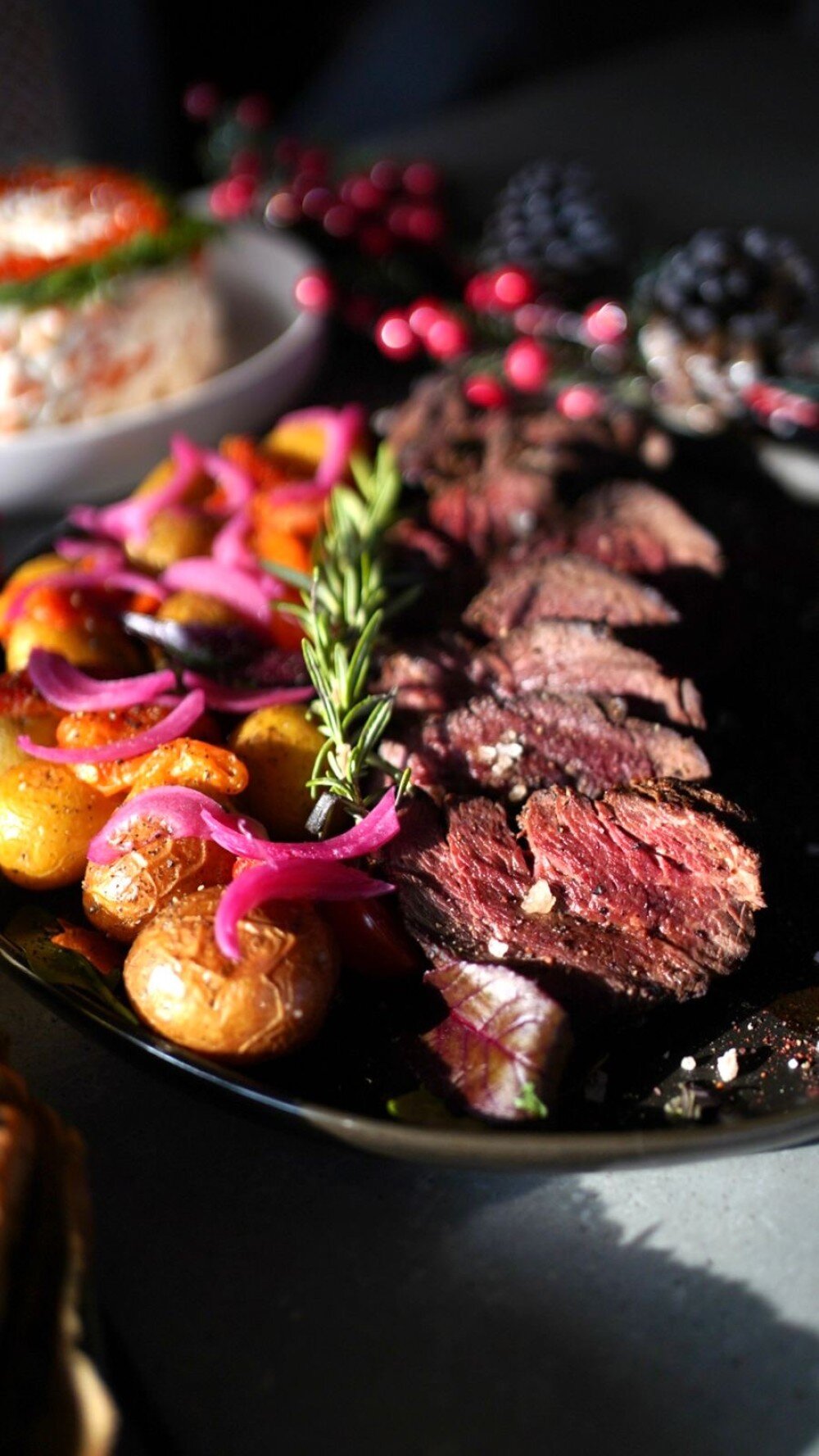 Ростбиф тендерлойн с соусом из лесной клюквы и золотистым бейби-картофелем